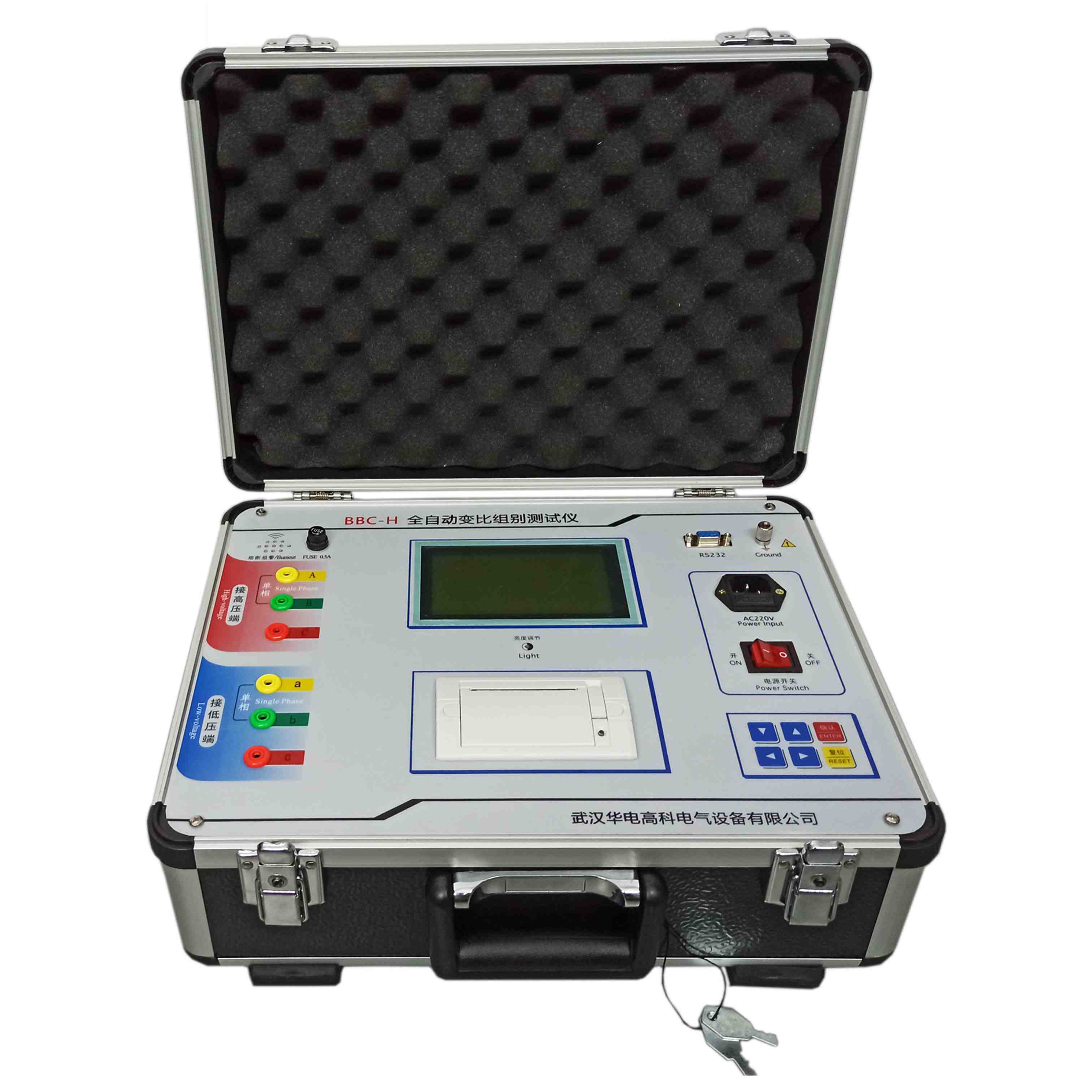 3.功能強大:既可進行單相測量,又可實現三相繞組的自動測試,聯接組別可任意選擇,一次完成測量AB、BC、CA三相的變比值、誤差、聯線組別等參數;